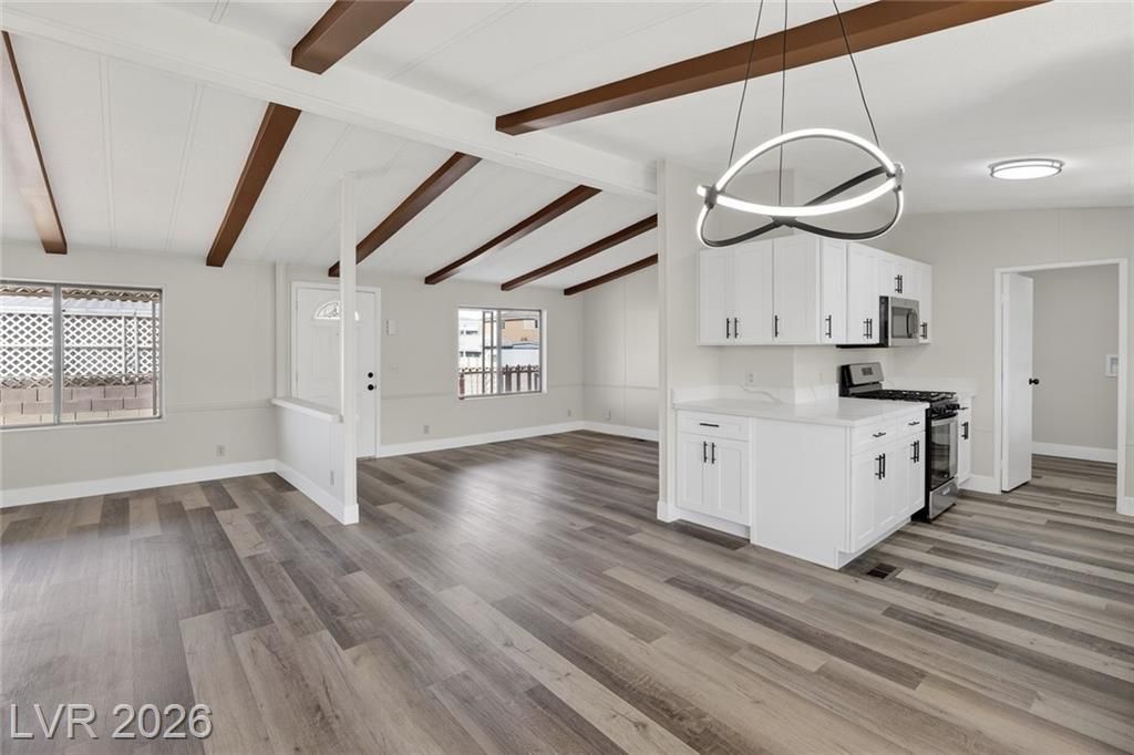 Welcome to this stunningly remodeled manufactured home, converted to real property. This home features NEW luxury vinyl flooring throughout the spacious living areas & all wet zones, combining style and functionality. Step into the HIGHLY upgraded kitchen, where you'll find NEW Shaker cabinets, NEW stainless steel appliances, & beautiful quartz counter-tops that make cooking a delight! The stylish faux wood ceiling accents add a touch of elegance, complemented by designer fixtures throughout the home. Both the primary and secondary bedrooms are generously sized and boast NEW upgraded carpet, ensuring comfort and warmth. The bathrooms are a true highlight, featuring brand NEW vanities, NEW quartz counters, & custom tile work that adds a spa-like feel. Freshly painted inside & out, this home is move-in ready. The new low-maintenance desert landscaping enhances curb appeal while providing easy upkeep. Don't miss the opportunity to make this beautifully transformed space your own!