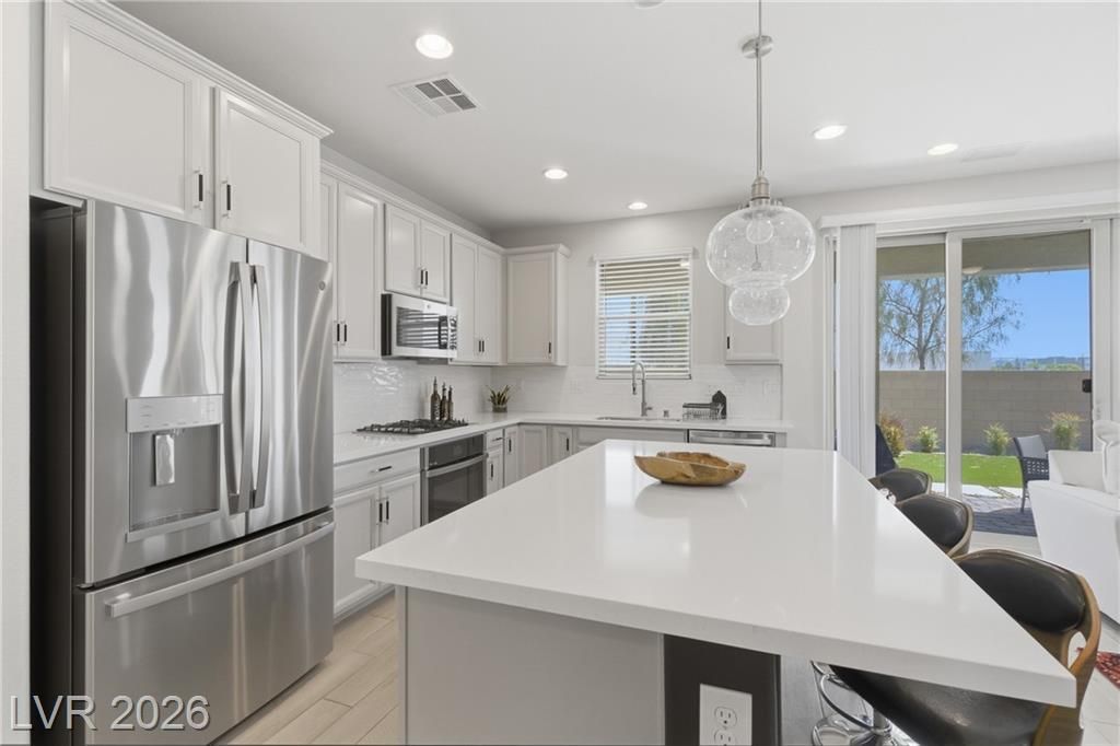 Beautifully upgraded former Richmond model home that shows like new with 9' ceilings & 8' doors throughout! This gem features a paver driveway & welcoming courtyard entry, setting the tone for its elevated design. Inside, the spacious family room is enhanced by surround sound and center-meet sliding glass doors that seamlessly open to an extended covered patio, perfect for indoor-outdoor living. The TV mount will stay. Gourmet kitchen is a standout, offering a premium stainless steel appliance package, upgraded quartz countertops, elegant Premier maple cabinetry, and decorative backsplash. The kitchen and bathrooms showcase upgraded high-end finishes. The loft features a built-in desk and cabinets, just right for an office area. Step outside to a water-efficient, low-maintenance backyard complete with synthetic grass and a covered patio, ideal for relaxing or entertaining year-round. This home combines style, comfort, and functionality in every detail and features upgrades throughout.
